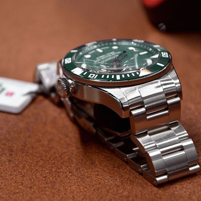 La lunette tournante unicolore vert, est assortie au 3 composants de la montre : le boitier et le bracelet poli, ainsi que le sublime cadran de la montre.