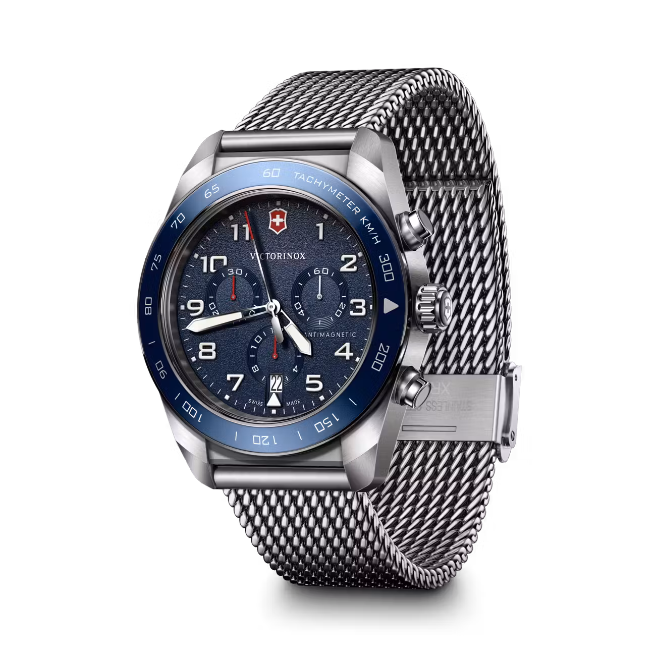 Alliance parfaite entre élégance contemporaine et précision suisse, la Victorinox Swiss Army Chronograph Milanais 242049 s’impose comme un garde-temps d’exception. Conçue pour les sportifs, voyageurs et explorateurs modernes, elle combine technicité, robustesse et raffinement avec son cadran bleu profond et son bracelet milanais ajustable.