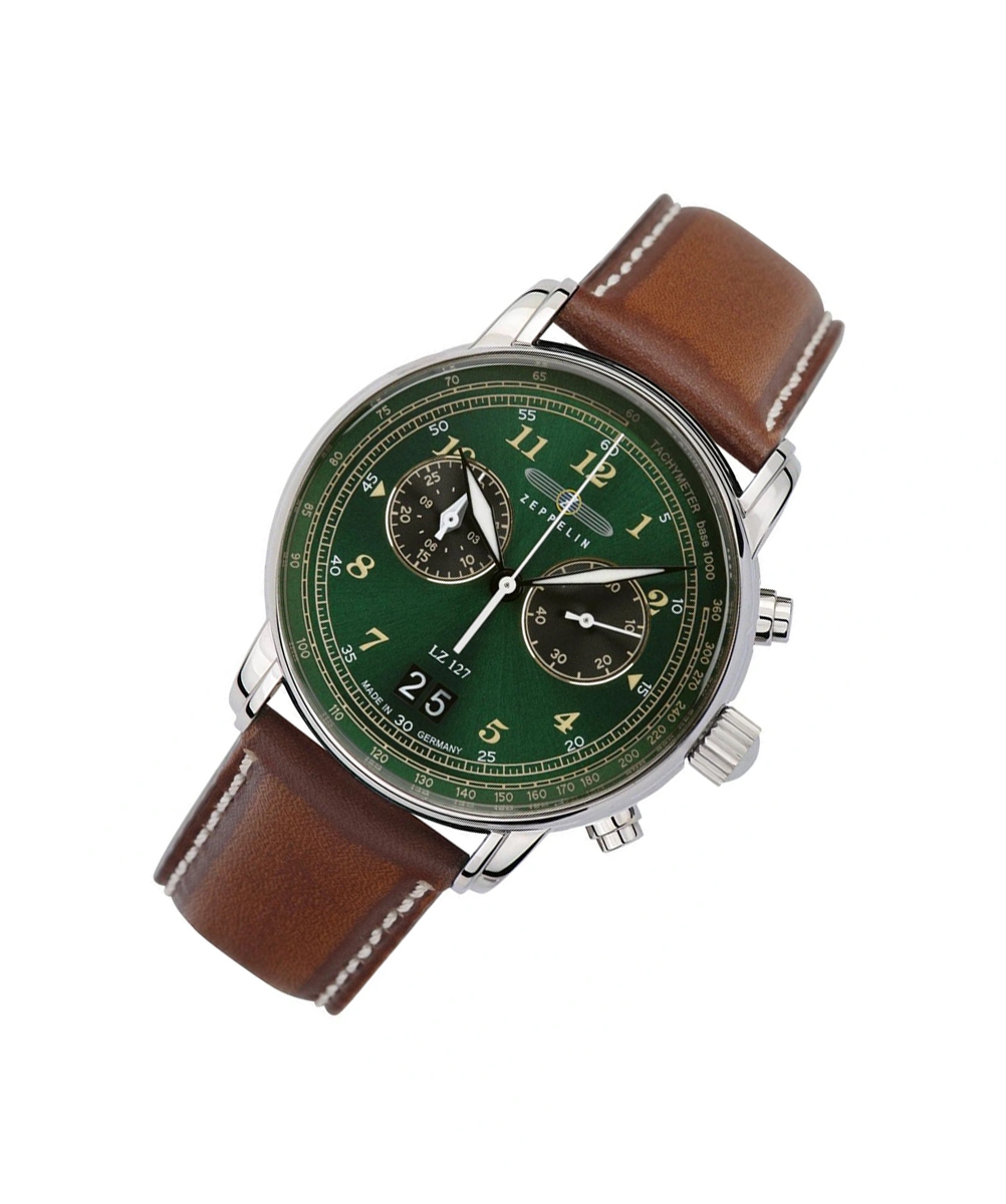 Arborant un cadran vert, le modèle LZ 127 Graf Zeppelin est équipé d’un verre Minéral garantissant un design original.