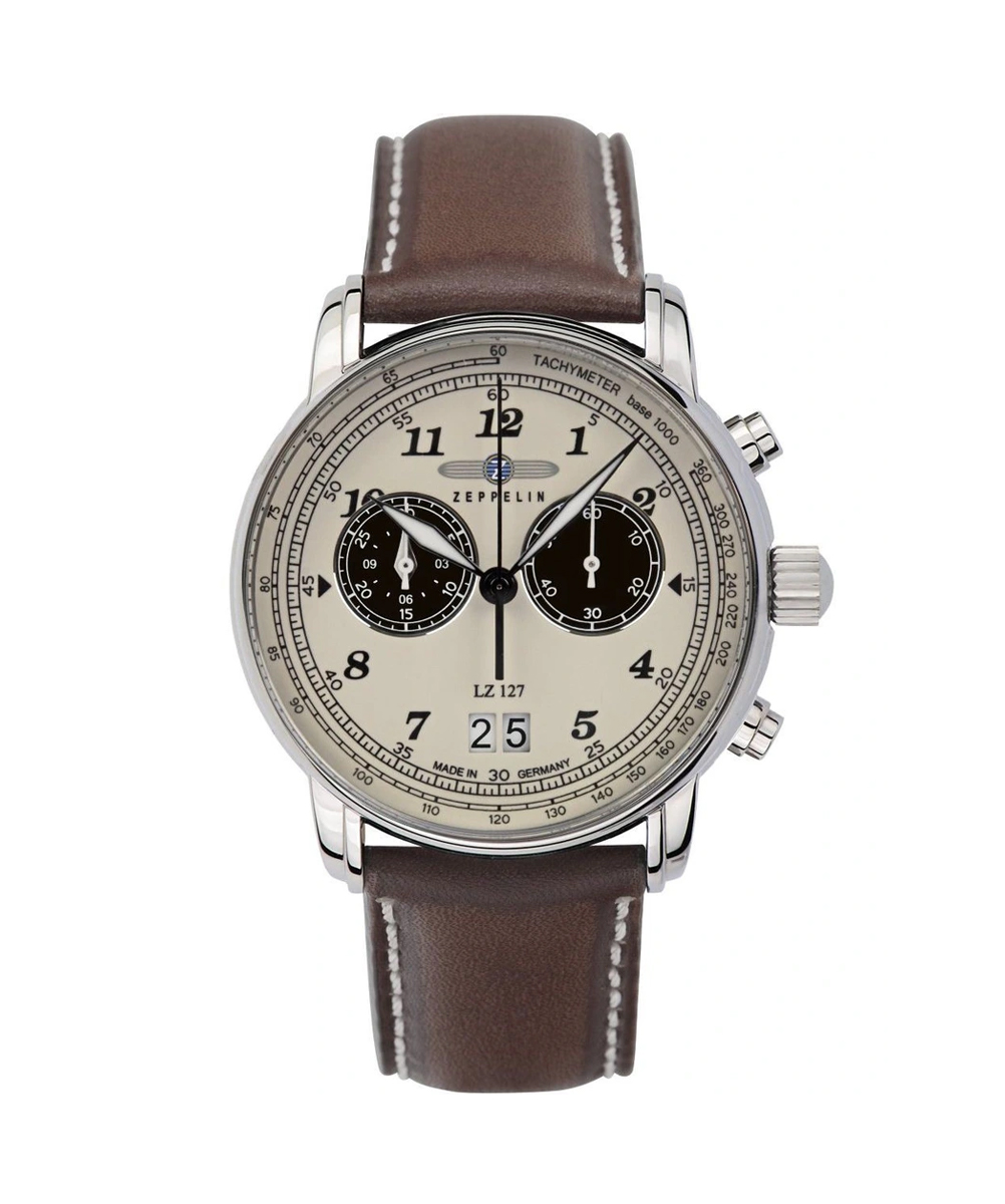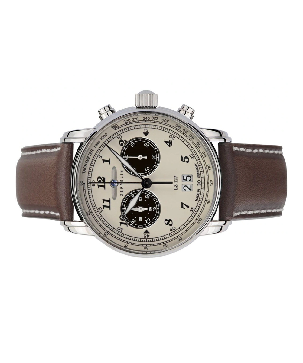 Arborant un cadran blanc, le modèle LZ 127 Graf Zeppelin est équipé d’un verre Minéral garantissant un design original.