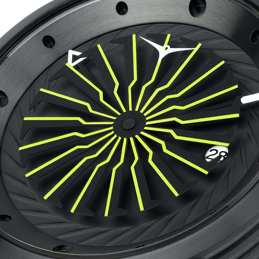C’est d’ailleurs son boitier qui captive d’une puissante manière le regard. Sur la première image, on retrouve à 10 heures l’aiguille des heures (à la forme triangulaire) ; l’aiguille des minutes est quant à elle présente à 2 heures, en forme de petit bâtonnet cette fois. À équidistance, on retrouve à midi le logo ailé de la marque, démontrant une présence en toute légèreté.