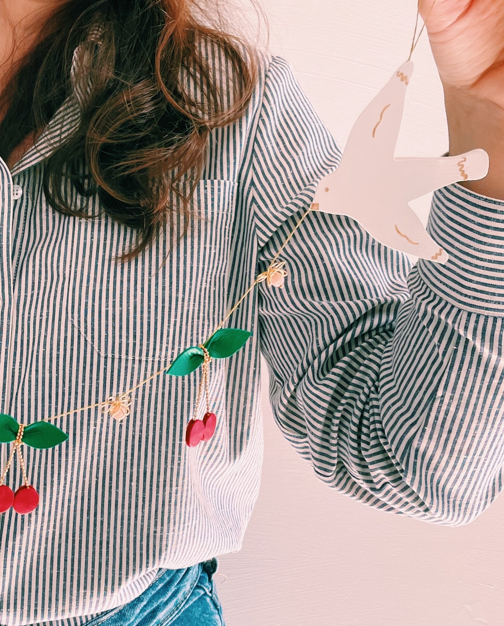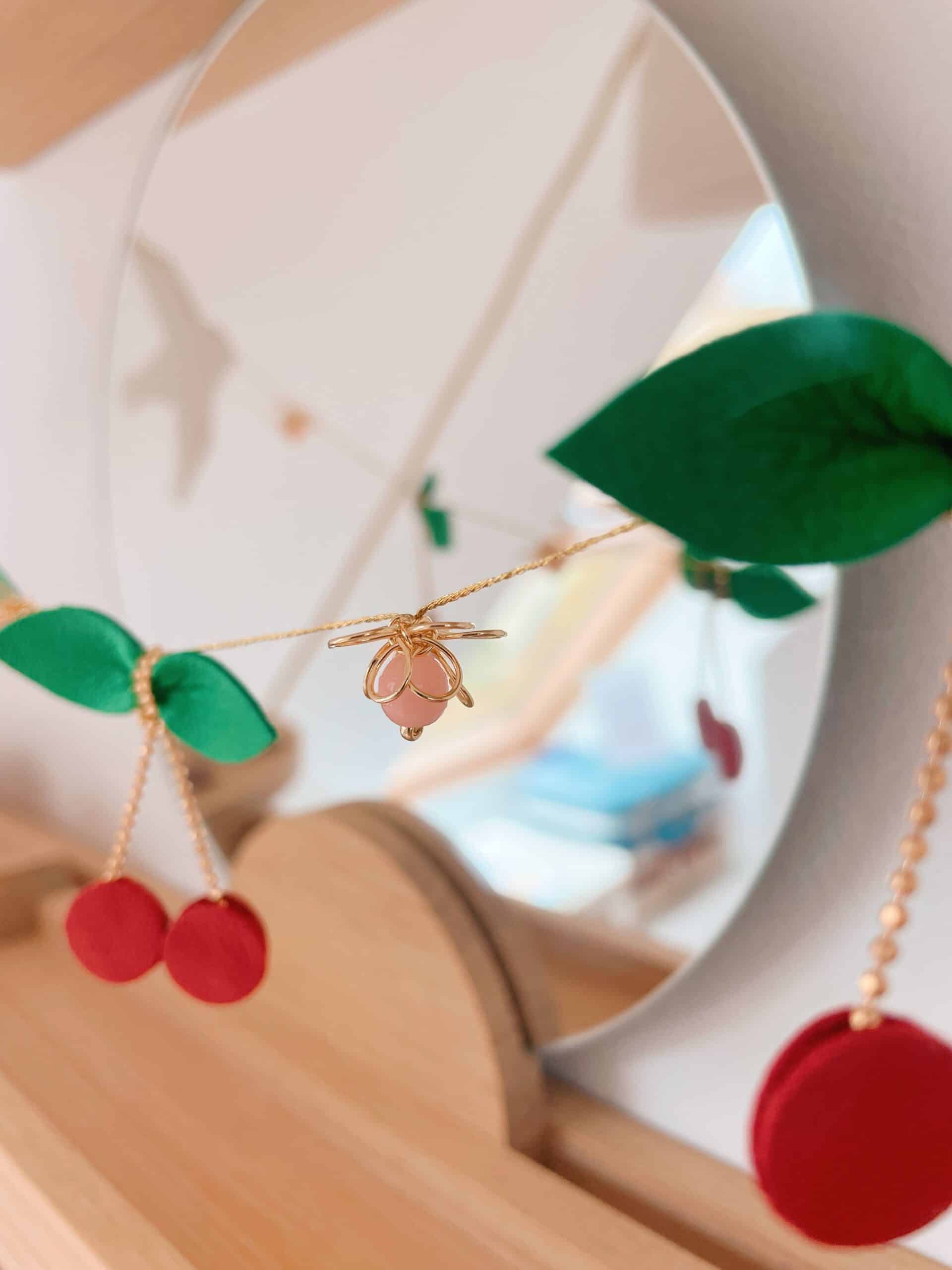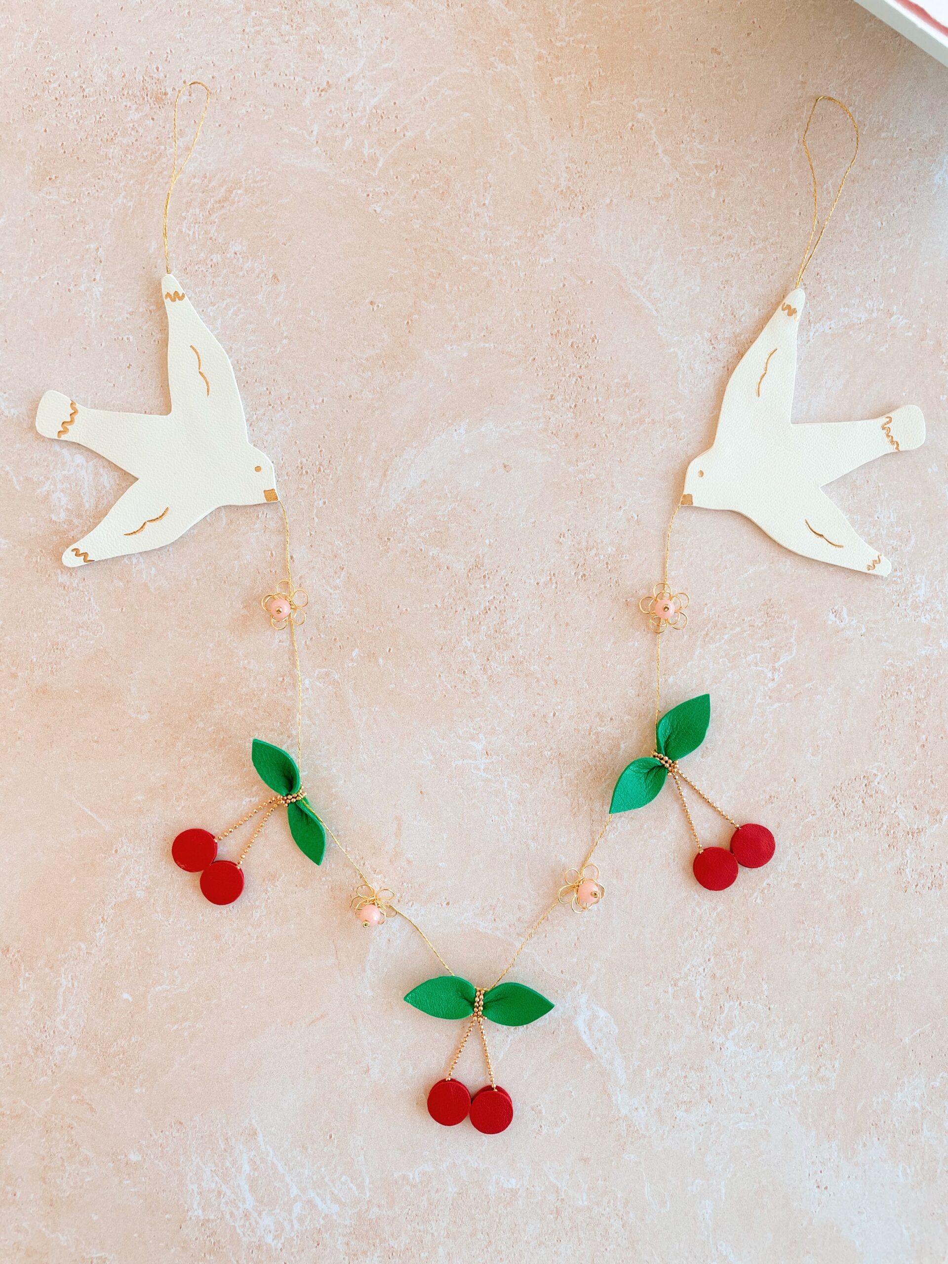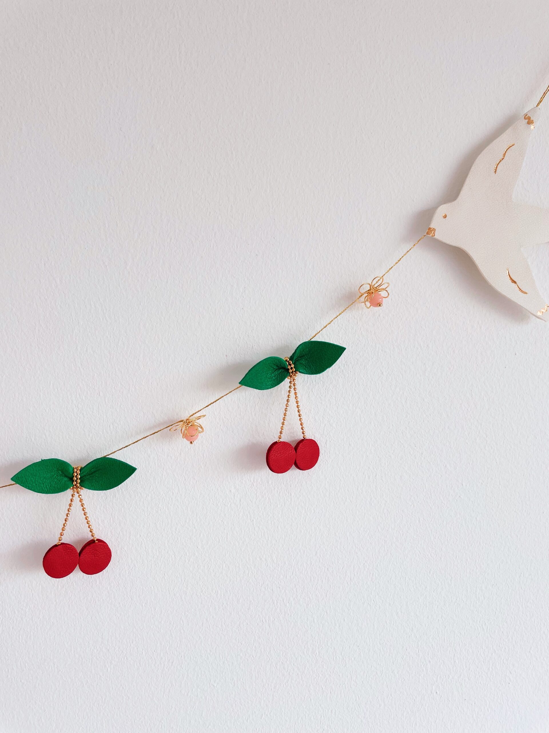 Découvrez ma collection de ribambelles, constituée de guirlandes décoratives durables en cuir surcyclé. Il s’agit d’un travail artisanal d’ennoblissement d’excédents provenant directement d’une tannerie française (upcycling). Cette guirlande de cerises et de fleurs, est encadrée d’oiseaux messagers, silencieux poètes, des mouettes qui évoquent symboliquement les colombes. Chaque détail est rehaussé d’or véritable, ajoutant une touche de luxe à cette composition délicate. Ce bijou mural, entièrement façonné et assemblé à la main, mêle fleurs de laiton doré, perles vintage de couleur rosée, chaîne boule et fil métallisé doré, pour un résultat d’une finesse inégalée. Une pièce unique qui apportera une touche de poésie et de raffinement à votre intérieur. Elle peut être déclinée sur commande dans d’autres coloris et modèles. Cette décoration murale intemporelle est prévue pour se fixer contre un mur et ainsi sublimer n’importe quelle pièce de la maison. Elle fait aussi un cadeau idéal pour des fiançailles, un mariage, une naissance et autres jolies occasions qui rendent la vie plus jolie ou tout simplement pour se faire plaisir. A accrocher à l’aide des clous fournis ou de tout autre élément de fixation adapté à votre support. Cette ribambelle s’accorde parfaitement avec nos éternelles fleurs à la tige ou avec une paire de boucles d’oreilles. Pour en savoir plus concernant le processus de fabrication, mon engagement et les valeurs de la marque, cliquez ici