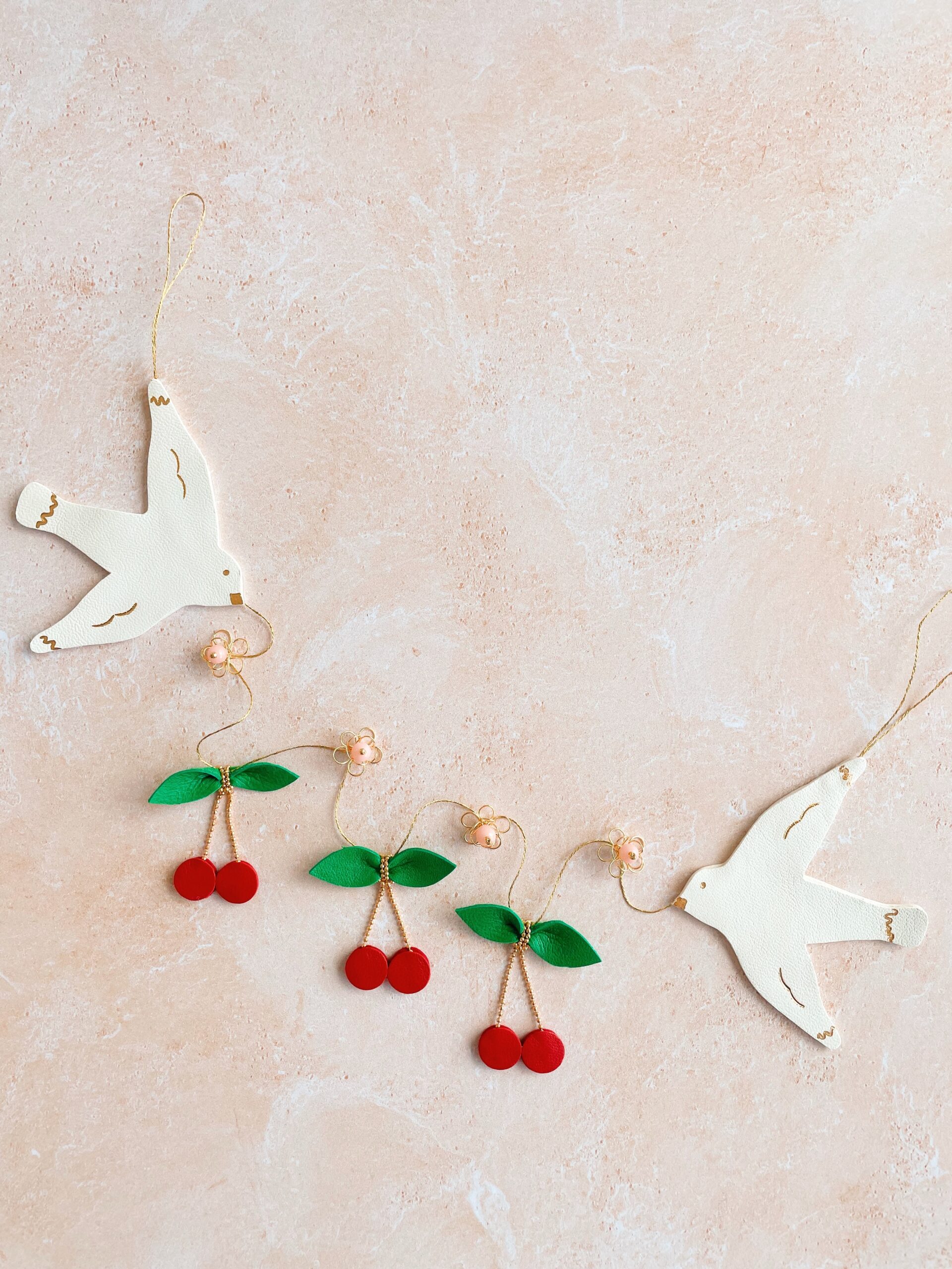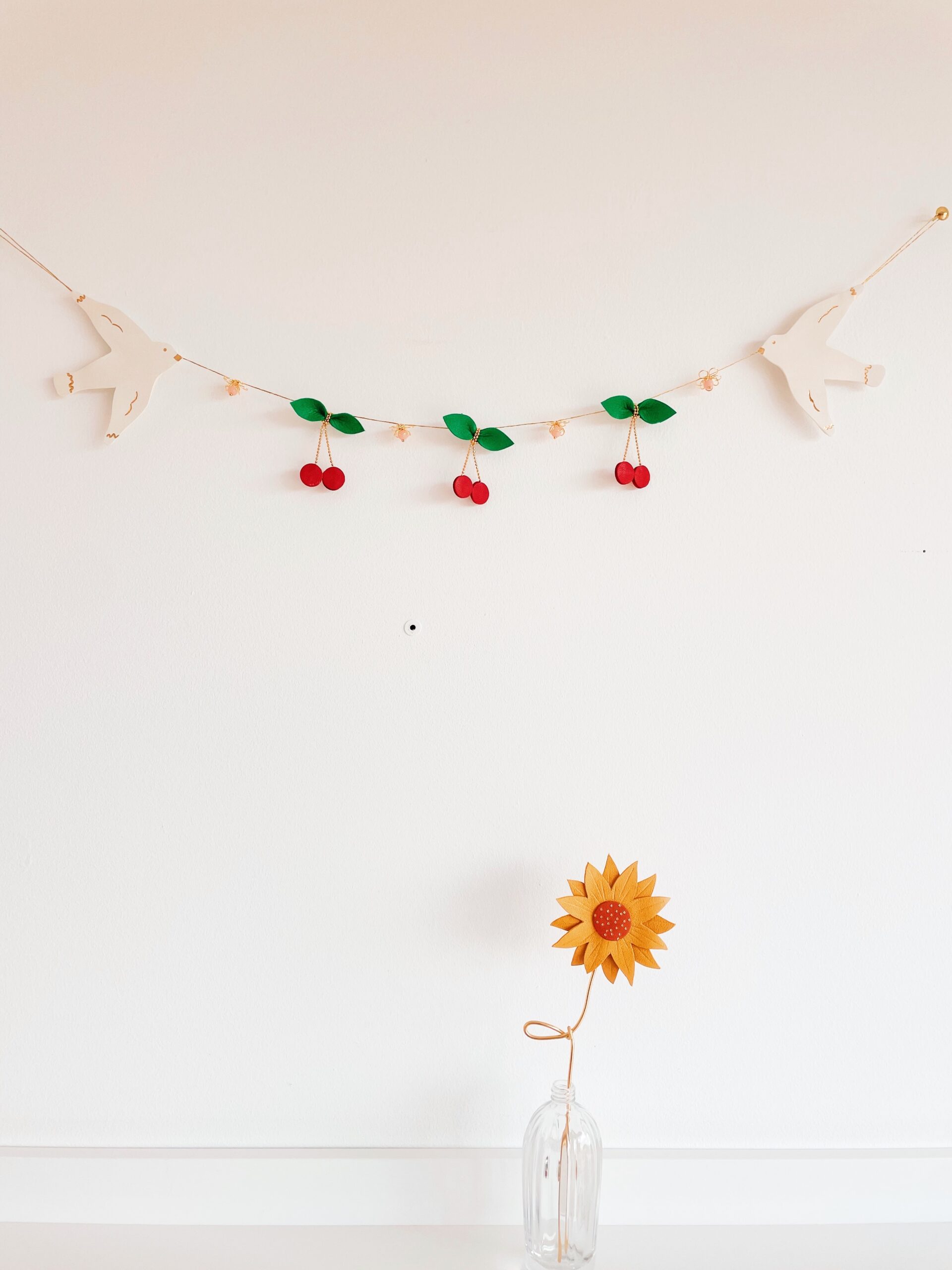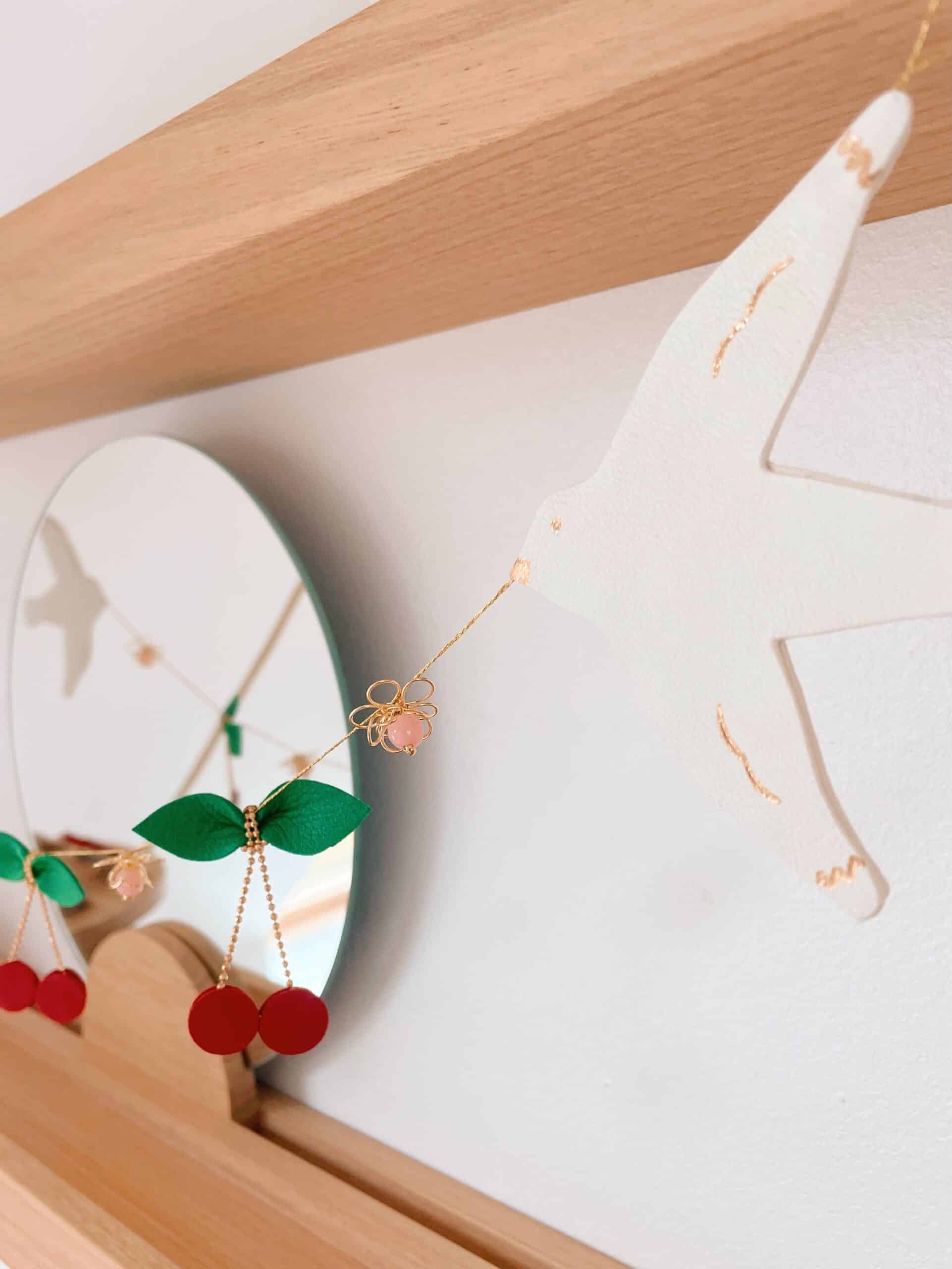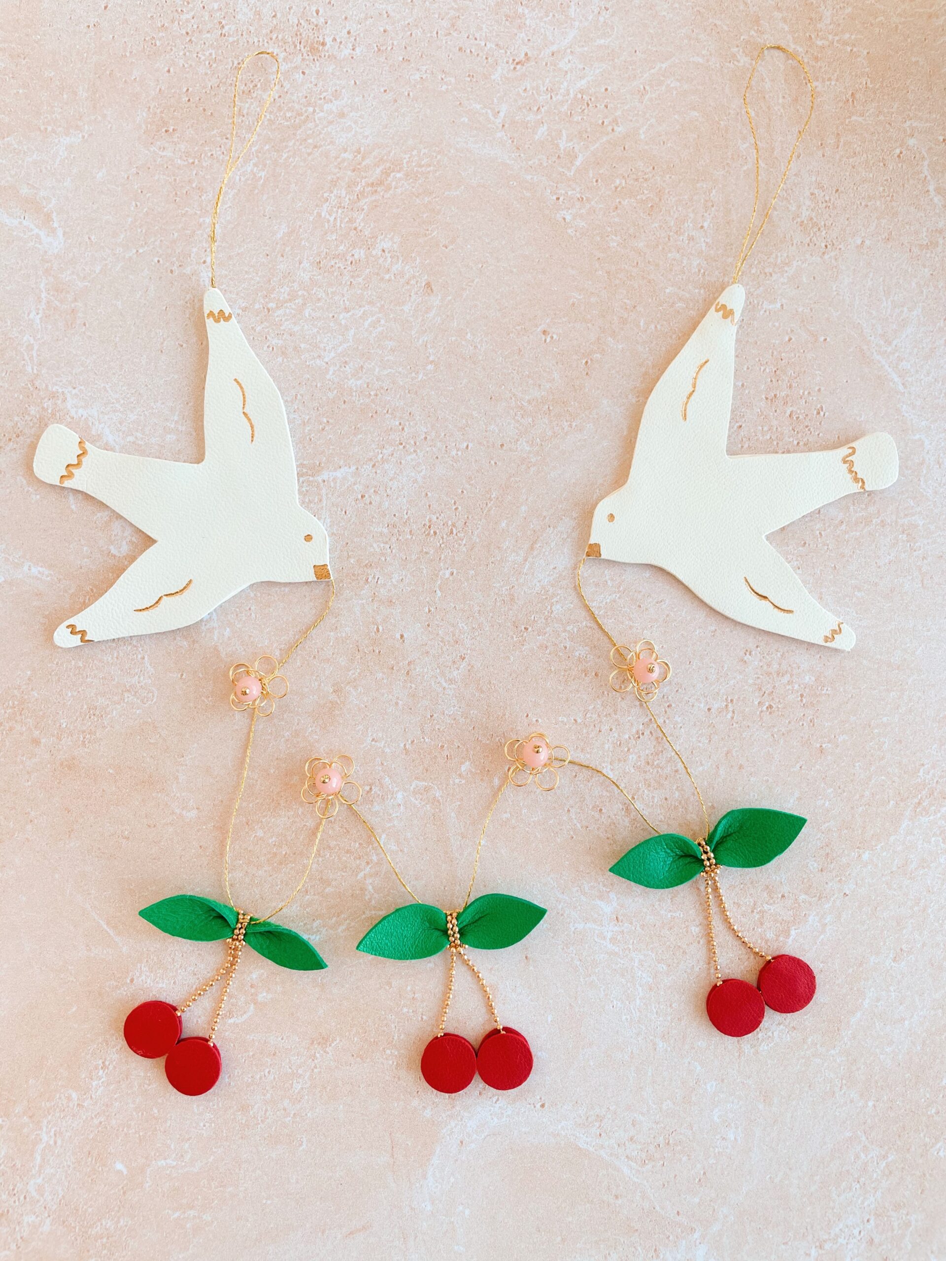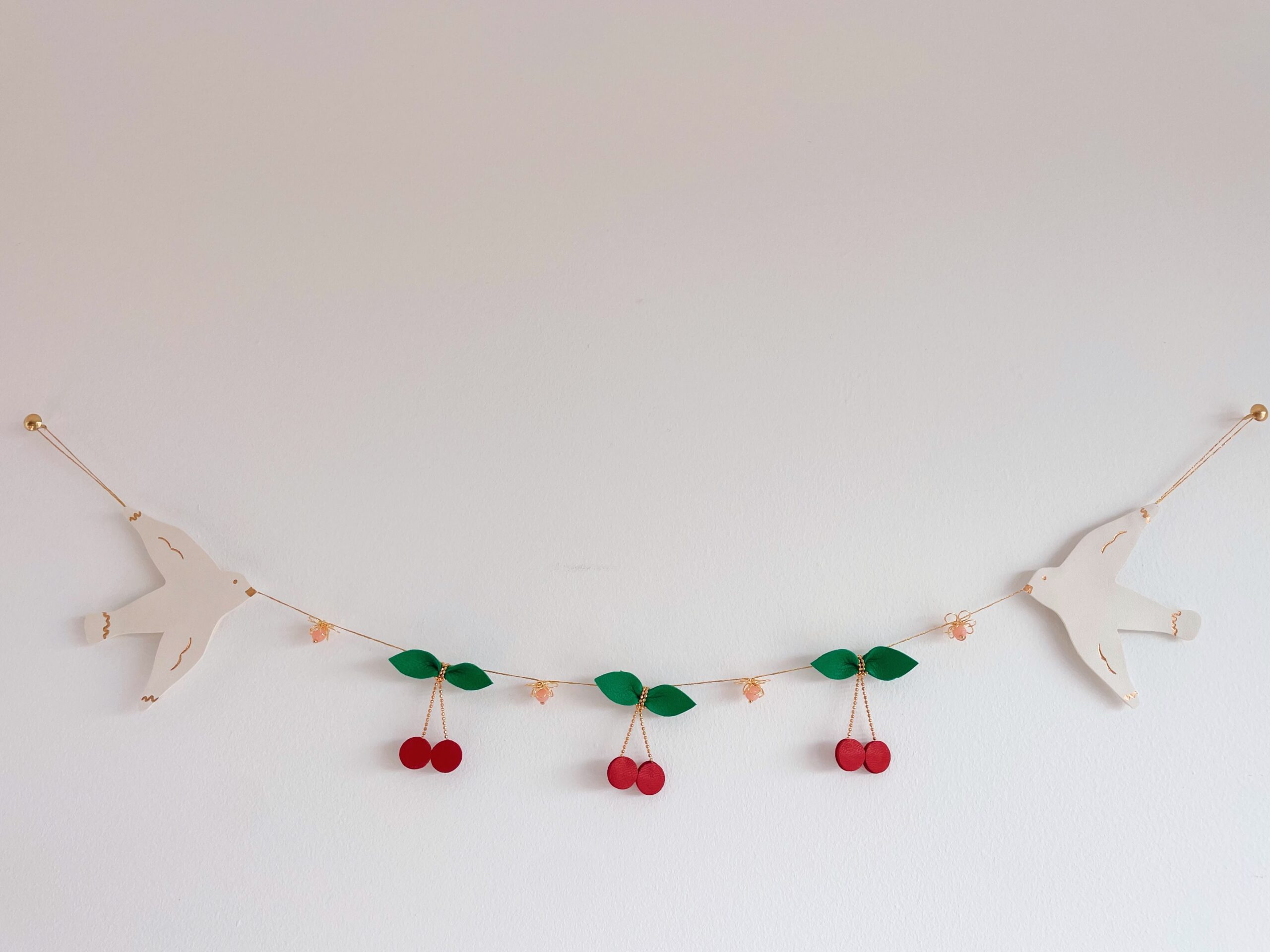 Cette jolie décoration murale de type ribambelle ou guirlande décorative alterne oiseaux blancs avec détails dorés à l’or fin, cerises et fleurs en laiton avec des perles vintage roses. Elégante et robuste, elle fait partie de la collection des bijoux muraux ou bijoux d’espace, ces objets poétiques raffinés en cuir surcyclé (revalorisation d’excédents de tannerie dans une démarche responsable d’utilisation des matières premières, “upcycling”). Durables et légères, elles sont minutieusement découpées main à partir de gabarits exclusifs. Ces décorations murales naissent dans mon atelier d’artisan métier d’art sur la terre des 2 caps (Côte d’opale en France). Chacune de ces ribambelles est unique. Les motifs sont réalisés à partir de cuir d’ovins de provenance française et ils sont dorés à chaud à l’or véritable. Comme il s’agit de chutes de cuir, les coloris peuvent varier légèrement selon les morceaux utilisés.