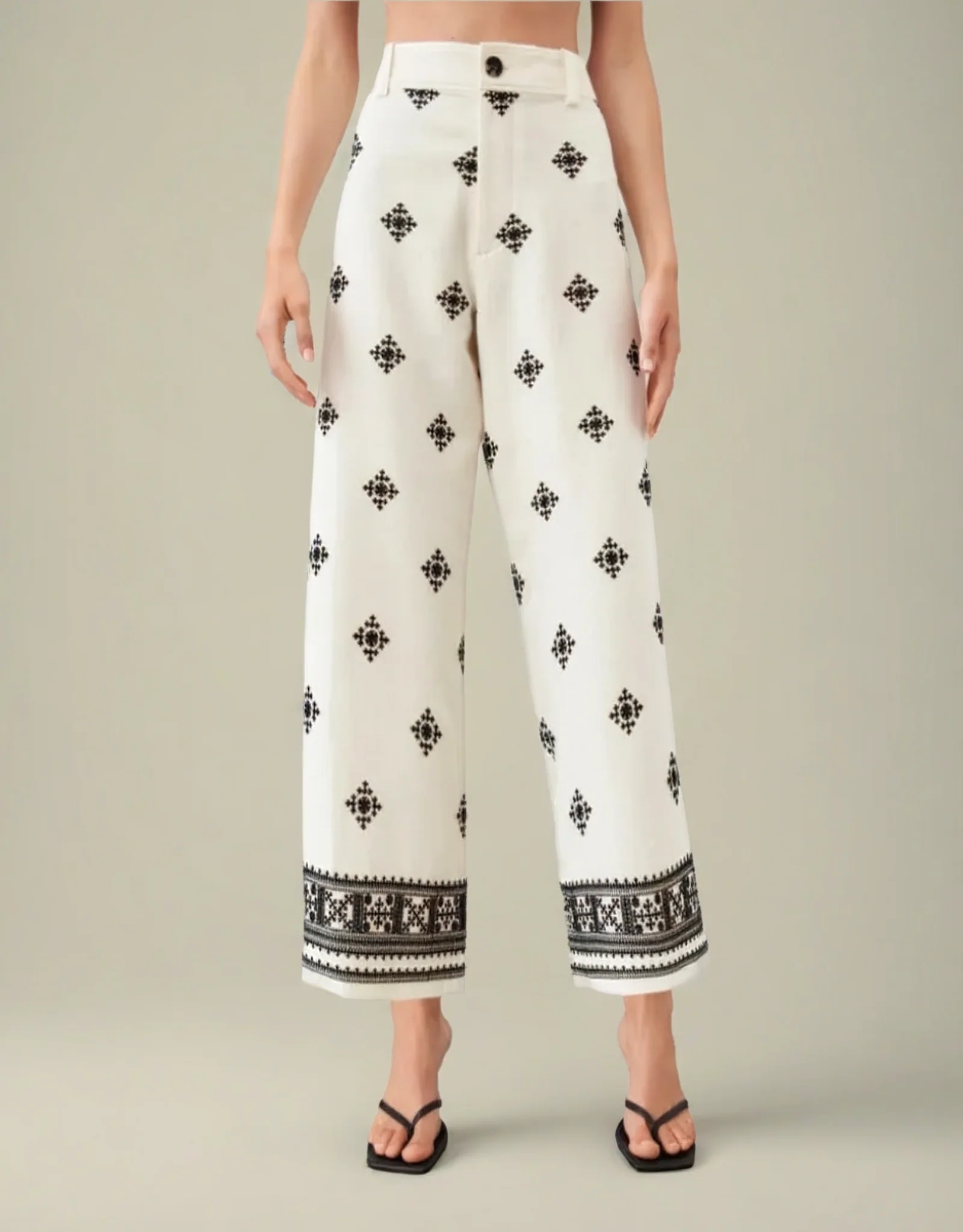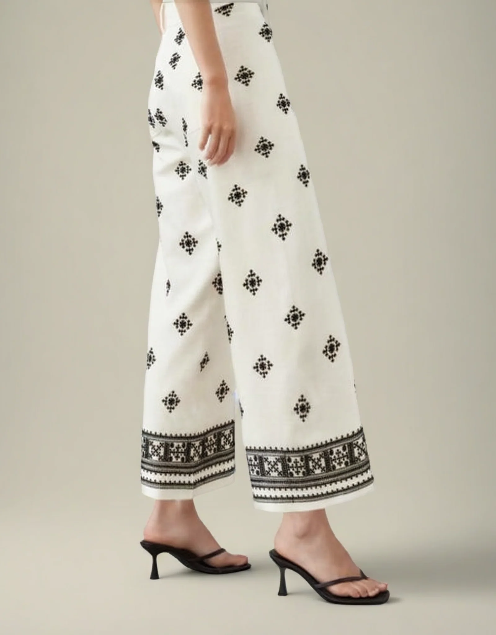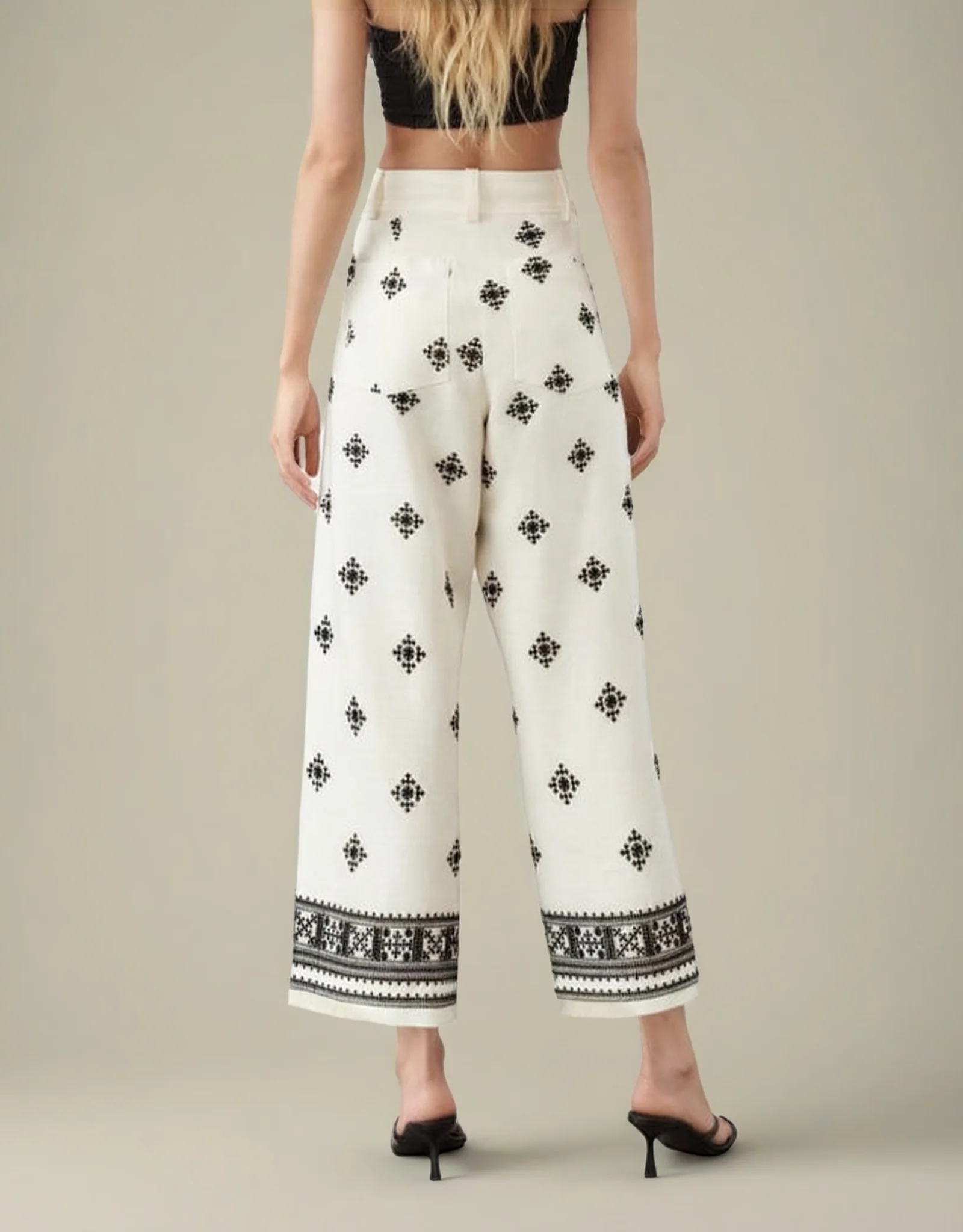 Pantalon vintage en satin avec braguette à boutons et décoration en broderie. Sa coupe ample, taille mi-haute et motif géométrique offrent un look chic et élégant, parfait pour une tenue stylée et confortable.