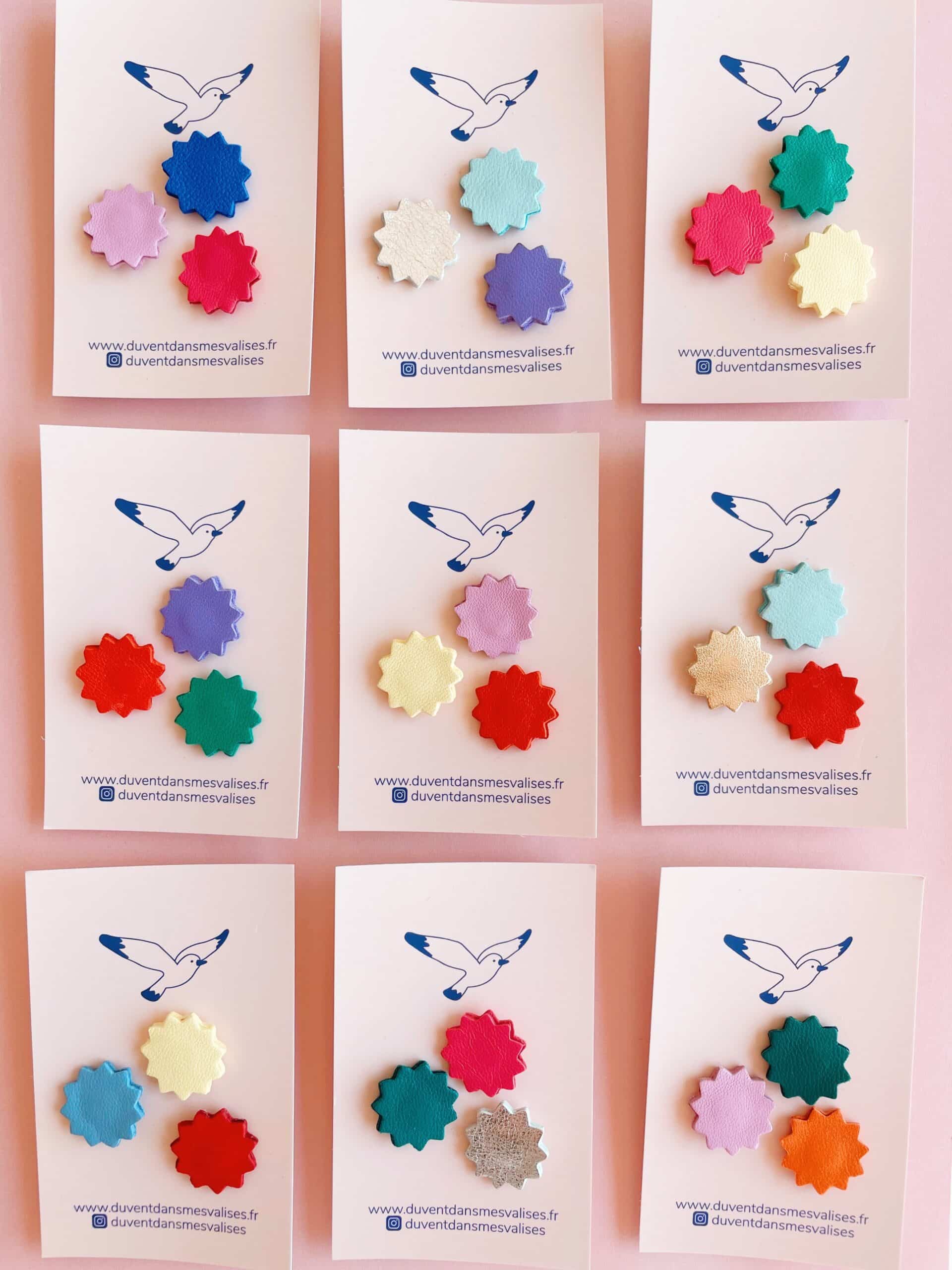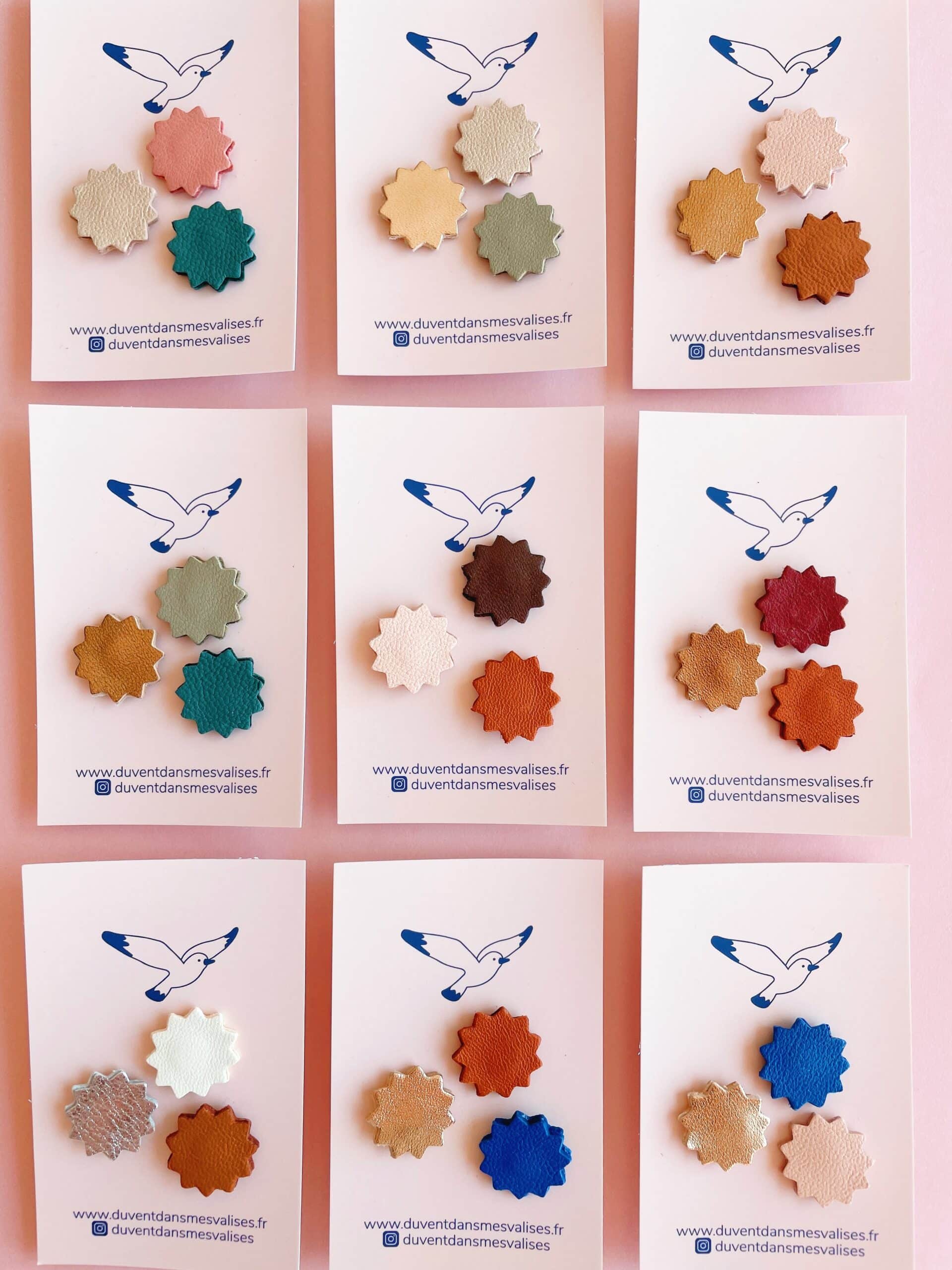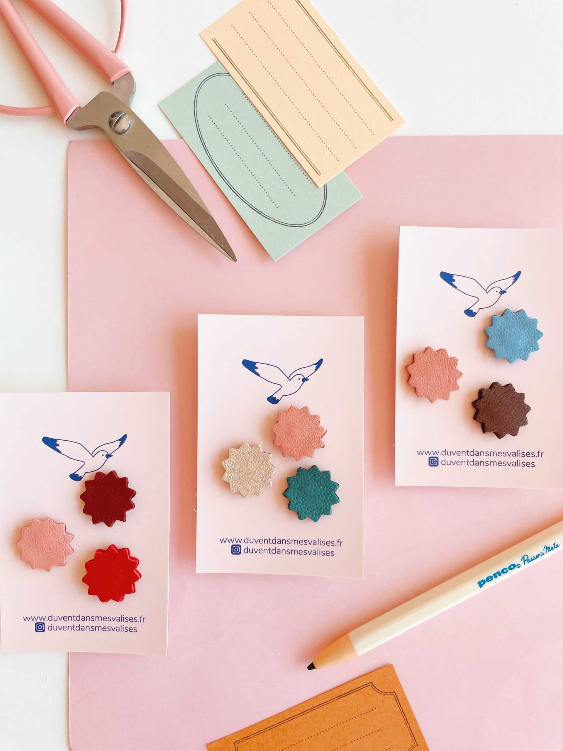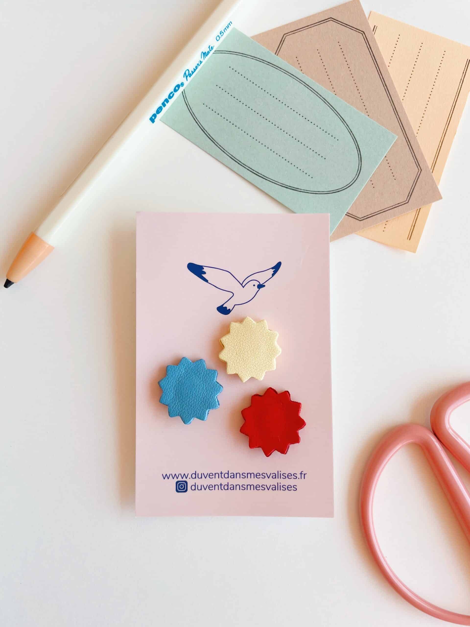 Ce joli trio de pin’s façon gommettes fait partie de la gamme des objets poétiques au charme désuet. C’est un bijou ludique au look délicieusement rétro en cuir surcyclé. Il est confectionné de façon artisanale par mes soins dans mon atelier sur la terre des 2 caps (côte d’opale en France). Chaque “gommette” est minutieusement découpée, doublée et assemblée. Chaque combinaison de couleurs est unique. Ces pin’s sont réalisés à partir d’excédents et coupons de cuir dans une démarche responsable de valorisation des matières premières (upcycling). Il s’agit de cuir d’ovins de provenance française et européenne. Le fermoir est en laiton doré or fin de provenance européenne. Comme il s’agit de chutes de cuir, les coloris peuvent varier légèrement. Egalement proposé en version personnalisée, choisissez vos coloris sur commande.