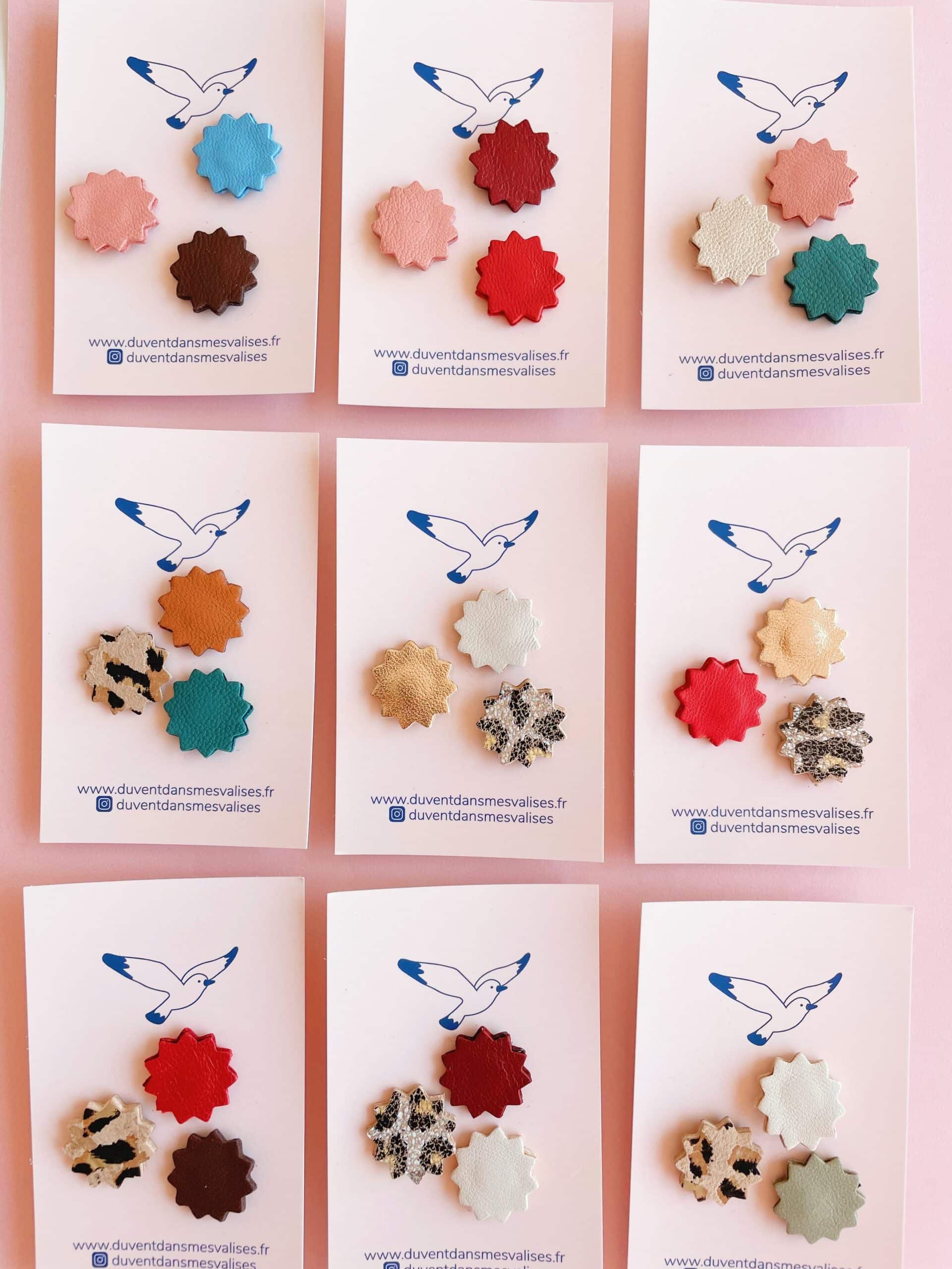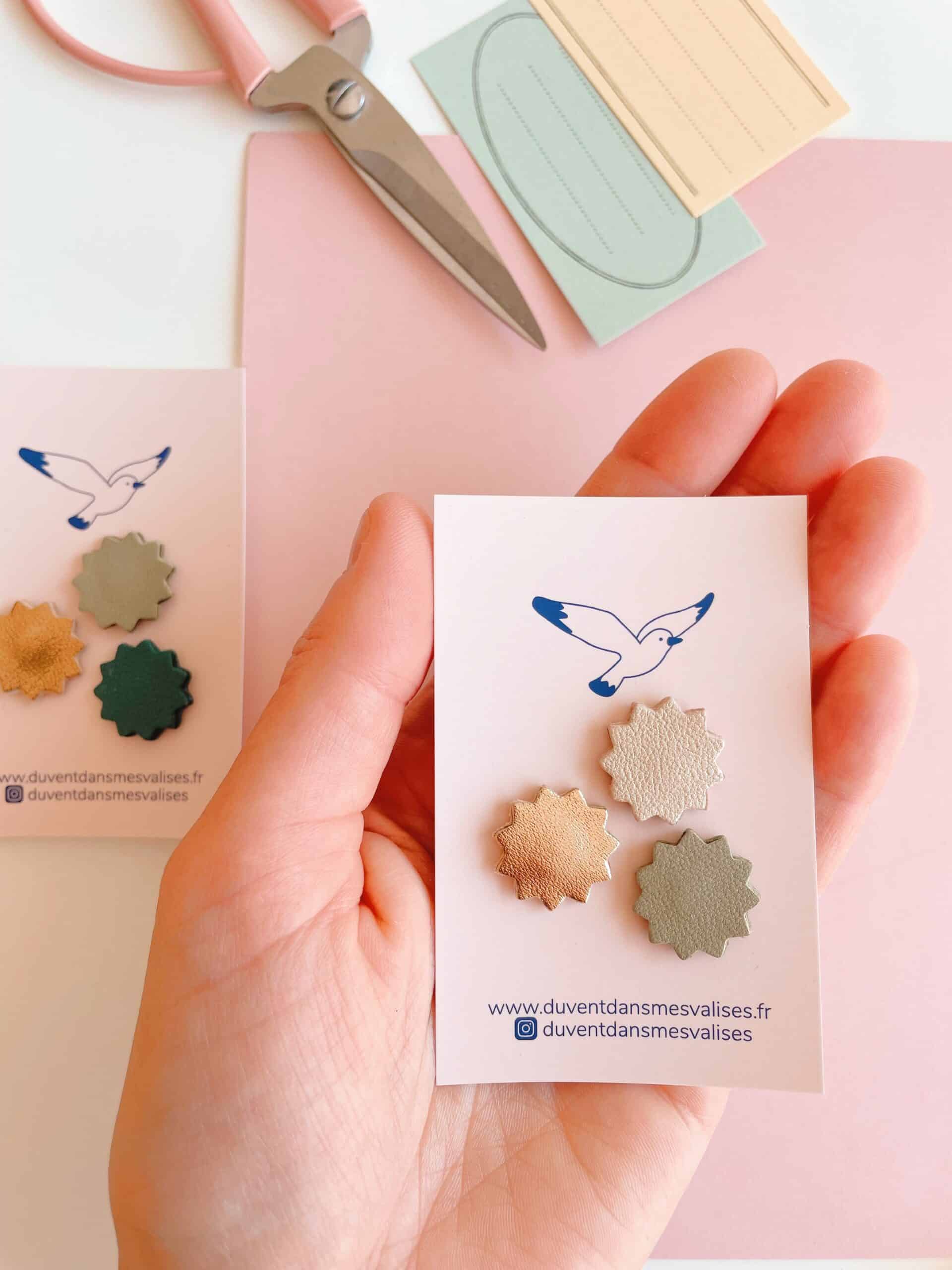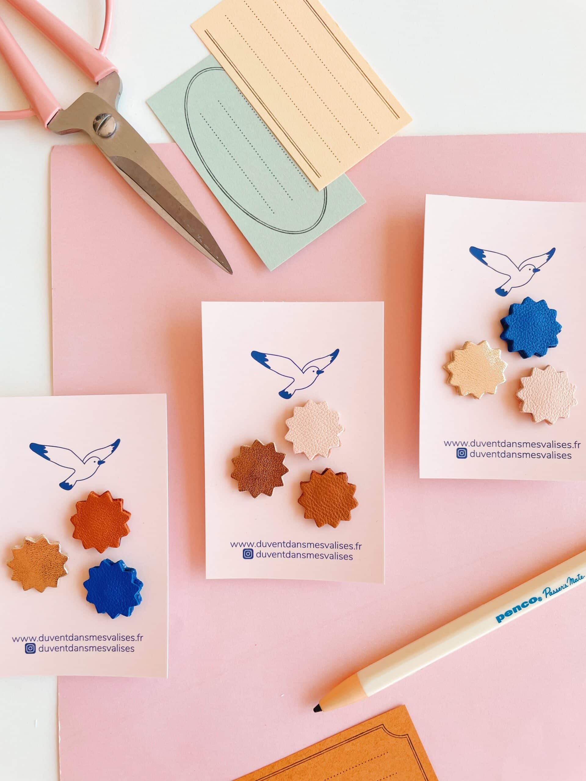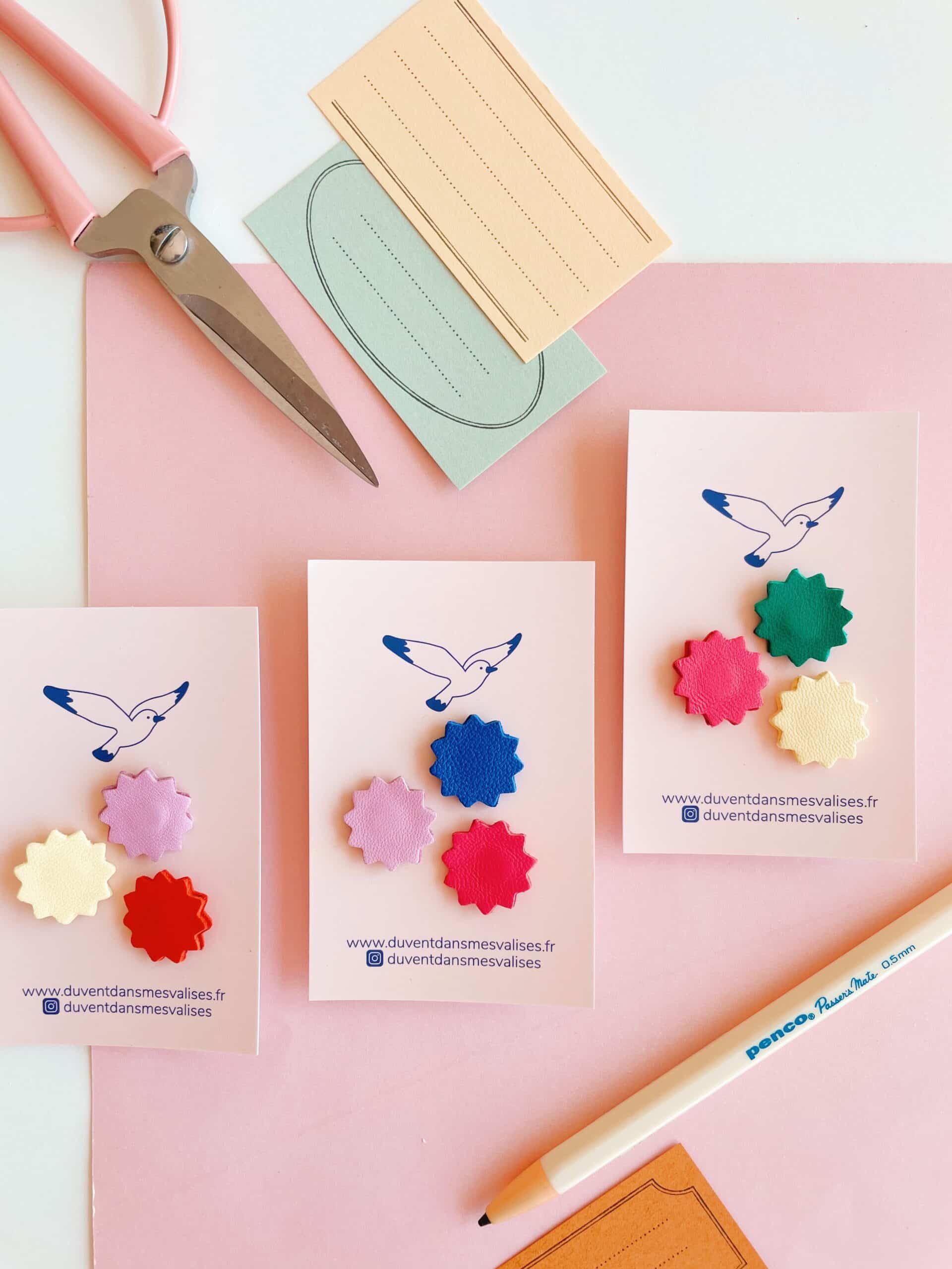 Ce joli trio de pin’s façon gommettes fait partie de la gamme des objets poétiques au charme désuet. C’est un bijou ludique au look délicieusement rétro en cuir surcyclé. Il est confectionné de façon artisanale par mes soins dans mon atelier sur la terre des 2 caps (côte d’opale en France). Chaque “gommette” est minutieusement découpée, doublée et assemblée. Chaque combinaison de couleurs est unique. Ces pin’s sont réalisés à partir d’excédents et coupons de cuir dans une démarche responsable de valorisation des matières premières (upcycling). Il s’agit de cuir d’ovins de provenance française et européenne. Le fermoir est en laiton doré or fin de provenance européenne. Comme il s’agit de chutes de cuir, les coloris peuvent varier légèrement. Egalement proposé en version personnalisée, choisissez vos coloris sur commande.