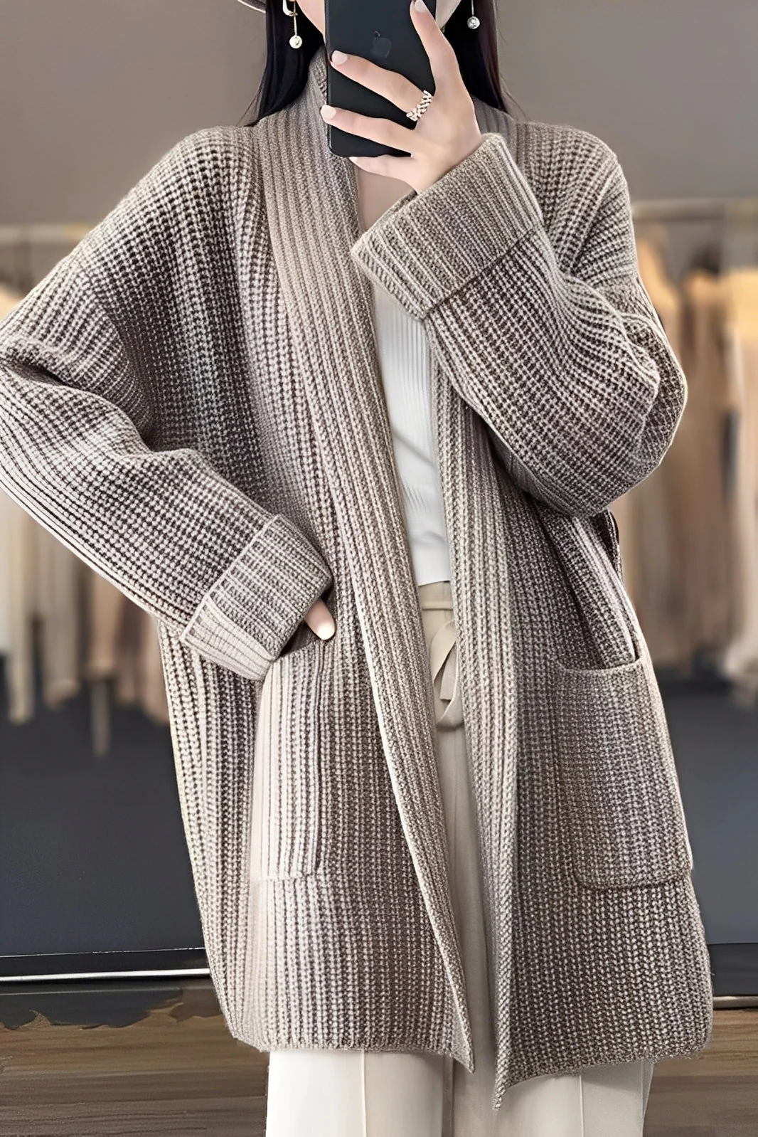 Le cardigan Suzanna se distingue par sa coupe longue et son ouverture, offrant une apparence féminine et élégante. Son tissu doux et agréable garantit un confort optimal – idéal pour le travail, les sorties ou le repos à la maison. Ce cardigan se marie facilement avec des blouses, des tops ou des robes, apportant une touche distinguée à chaque ensemble.