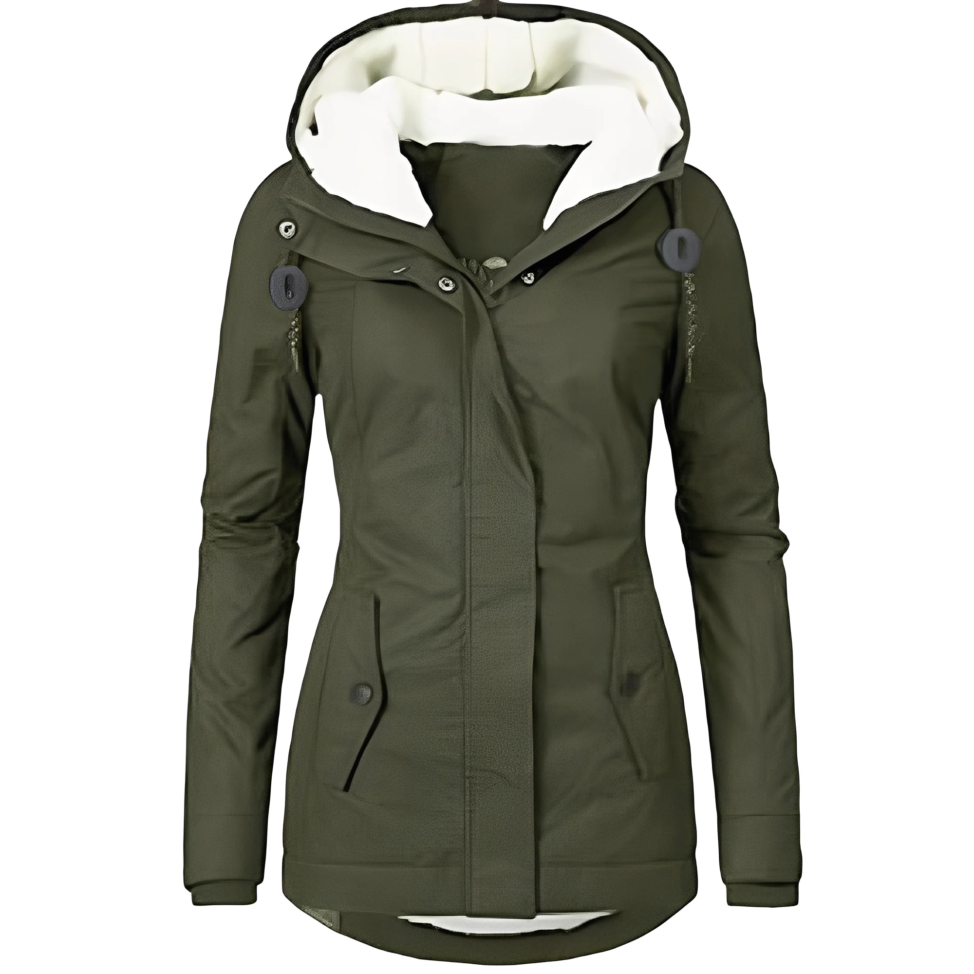 La veste « Valary » offre un aspect velours luxueux avec une fonctionnalité pratique. Son tissu imperméable protège bien de la pluie et du vent, tandis que sa doublure douce maintient une chaleur agréable. La capuche et la coupe ajustée créent une silhouette féminine – idéale pour les femmes attentives à leur style par temps froid et humide.