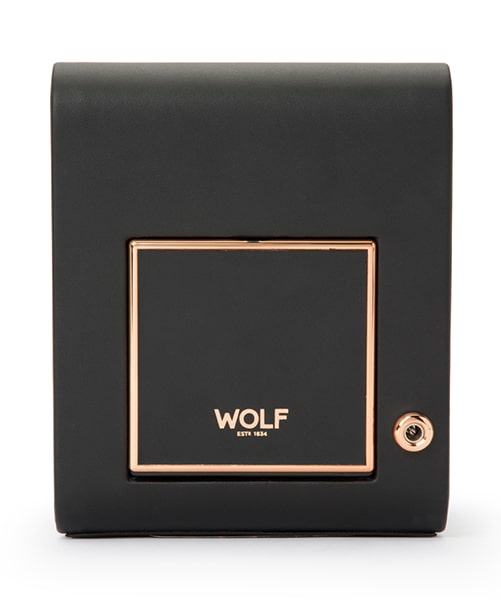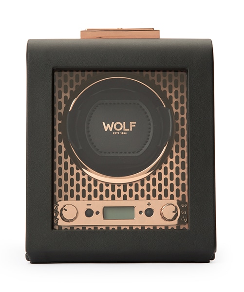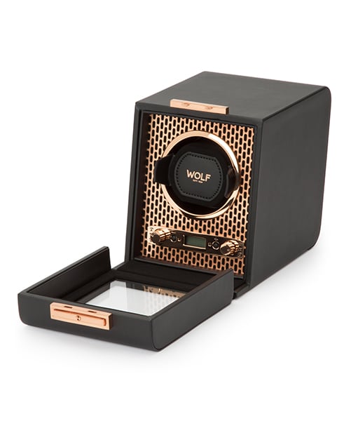 Acier perforé découpé au laser plaqué de cuivre fusionné avec des lignes épurées et épurées. AXIS propose un look moderne et audacieux pour la sauvegarde de vos montres. Notre technologie brevetée de comptage des rotations de l’axe de votre montre vous garantit des tours précis par jour. Luxe audacieux, design irréprochable, prenez AXIS pour un tour. Comprend un intérieur en microsuède, un couvercle en verre verrouillable, un écran LCD rétroéclairé, une quincaillerie au fini chrome mat et un module d’enroulement unique.