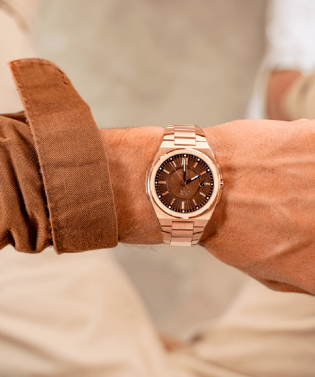 Boîtier fabriqué à la main en acier inoxydable 316L parfaitement assorti au bracelet de même matériau et brossé au plus haut niveau de qualité. Le boîtier ne mesure que 7 mm d’épaisseur pour s’adapter parfaitement à votre poignet.