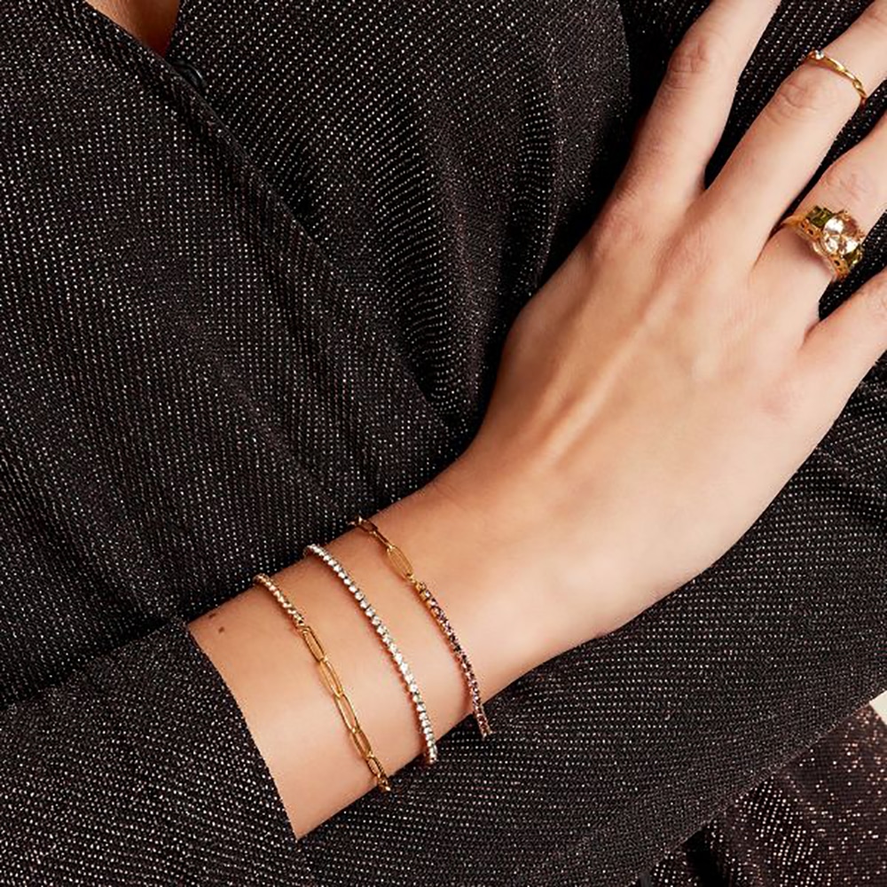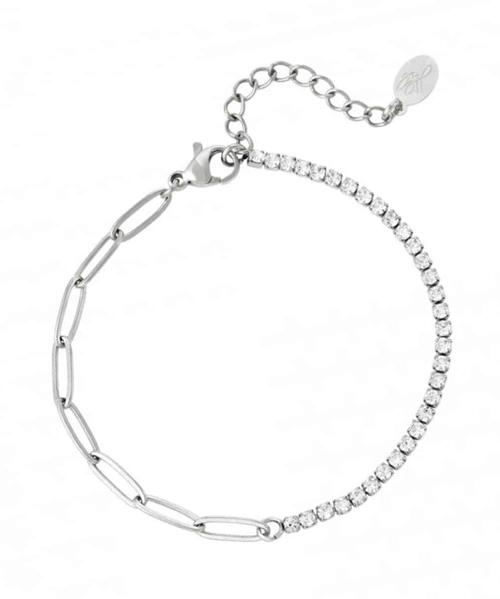 Bracelet en acier inoxydable avec d’un côté des pierres de zircon brillantes et de l’autre une chaîne.