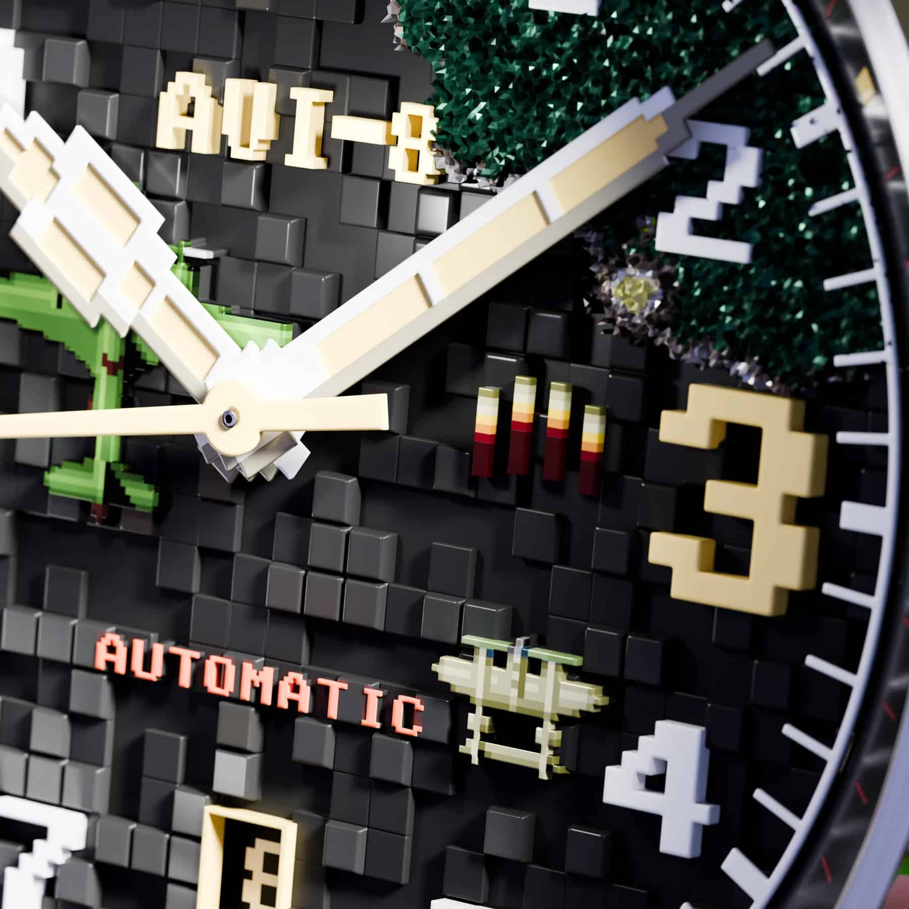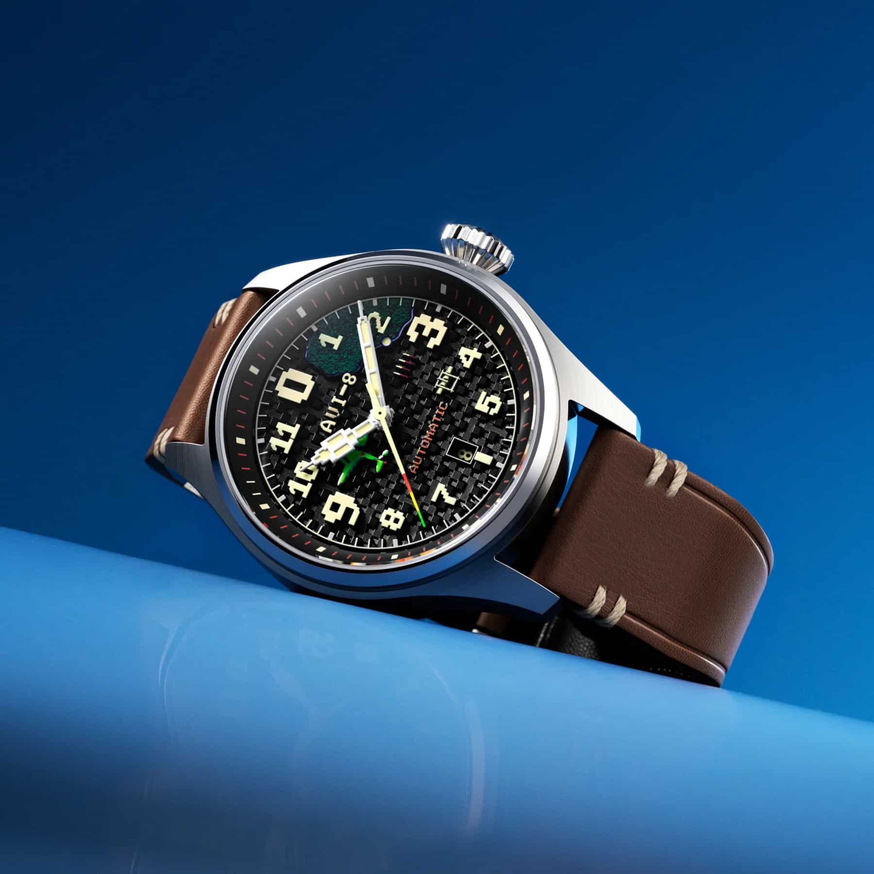 Son boîtier de 46 mm en acier inoxydable impose une présence forte au poignet tout en conservant un équilibre visuel remarquable grâce à une épaisseur maîtrisée de 13,8 mm. Les lignes robustes rappellent les instruments de cockpit, tandis que la couronne à tirer permet un réglage simple et précis. L’ensemble est protégé par un verre saphir traité antireflet, garantissant une excellente lisibilité et une résistance accrue aux rayures.