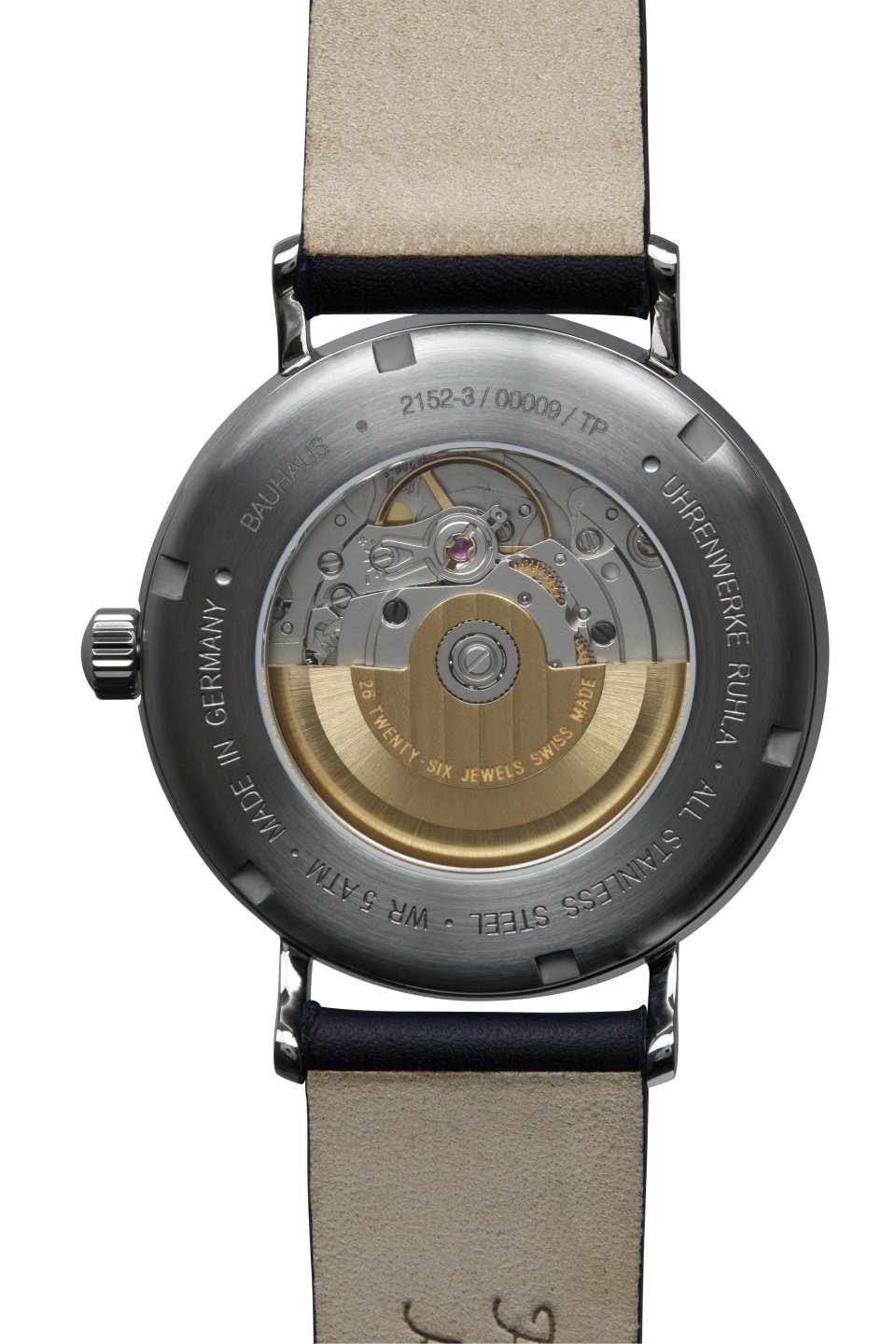 Ce garde-temps se présente doté d’un cadran bleu, mis en valeur par des index en bâtons au style Minimaliste et entouré de chiffres arabes. Harmonie oblige, le logo « Bauhaus » est accompagné de l’inscription « Automatic » couleur blanc.