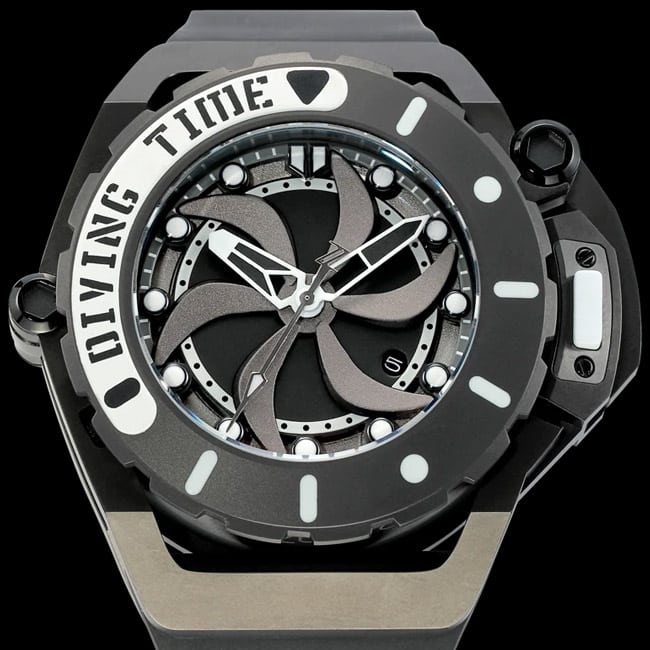 Version affichage de l’heure, le cadran de la montre mazzucato RIM Scuba est résolument inspiré d’une roue de voiture de course, avec jante et rayons.