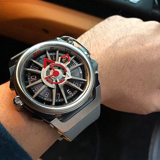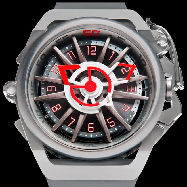 Version affichage de l’heure, le cadran de la montre mazzucato RIM sport est résolument inspiré d’une roue de voiture de course, avec jante et rayons.