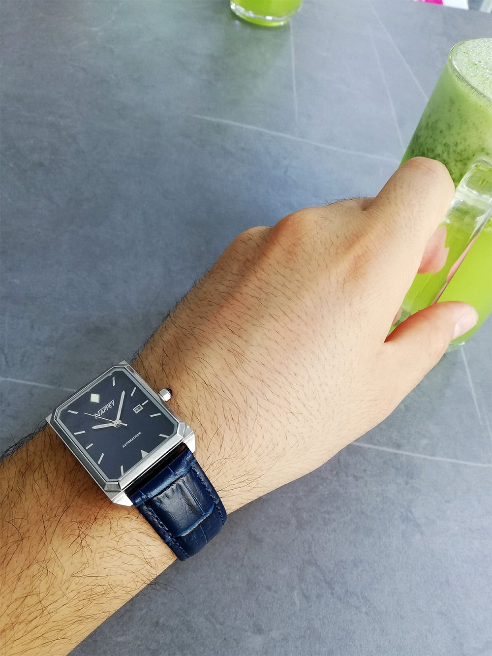 Aussi, le logo Nappey se retrouve à divers endroits, notamment au dos du bracelet ou sur la boucle ardillon. Enfin, la couronne vissée située à 3h, à la forme parfaite, reprend les traits hexagonaux du boîtier et permet le remontage manuel de la montre ainsi que sa mise à l’heure. Détail subtil, cette couronne est savamment décorée en Bleu, assortie à la couleur du boîtier.