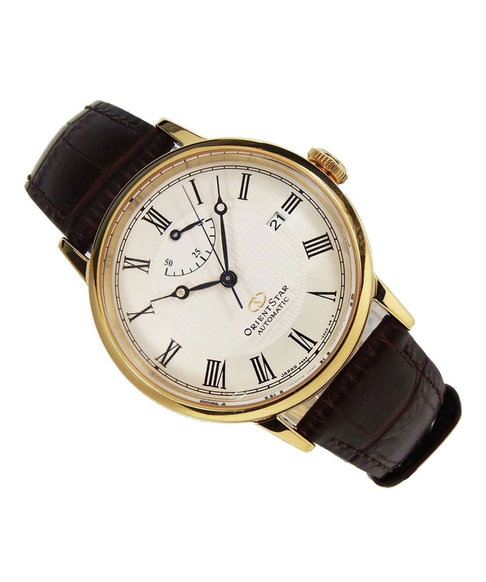 Son cadran blanc est quant à lui assorti à un bracelet marron. Cette finesse et ce sens du détail se retrouvent également avec grand art à deux endroits bien distincts ; la couronne est gravée du logo Orient Star ainsi que la masse oscillante, que l’on peut observer au dos de la montre, où y est inscrit le nom de la marque, son logo et son origine : le Japon.