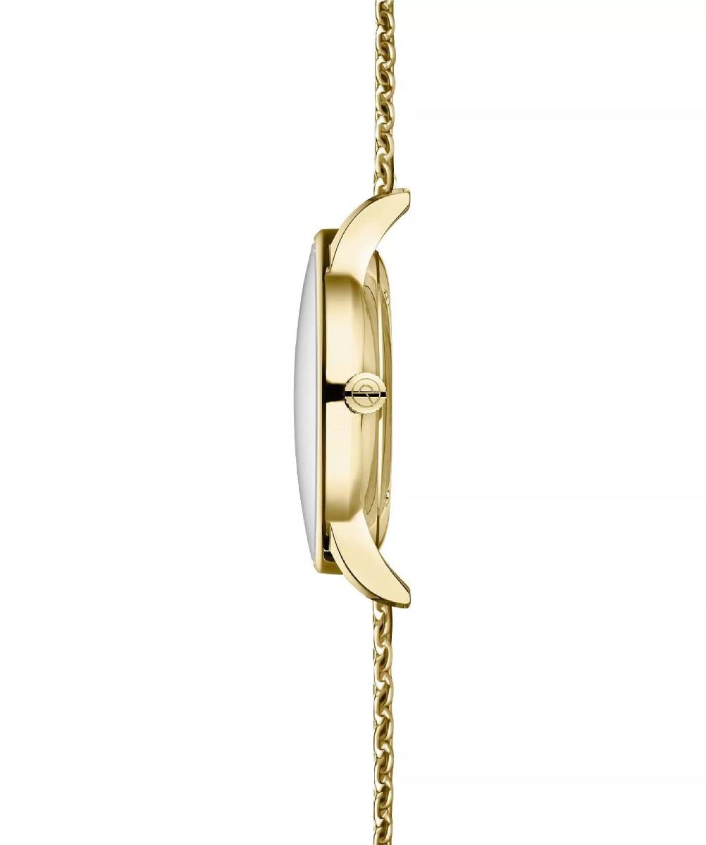 Cette montre de la collection Berlin présente un boîtier doré de 38 mm aux lignes équilibrées et à l’épaisseur maîtrisée de 8 mm, offrant une présence élégante sans être imposante. Son bracelet milanais doré, large de 20 mm, apporte une touche contemporaine et assure un confort optimal grâce à sa souplesse et son ajustement précis.