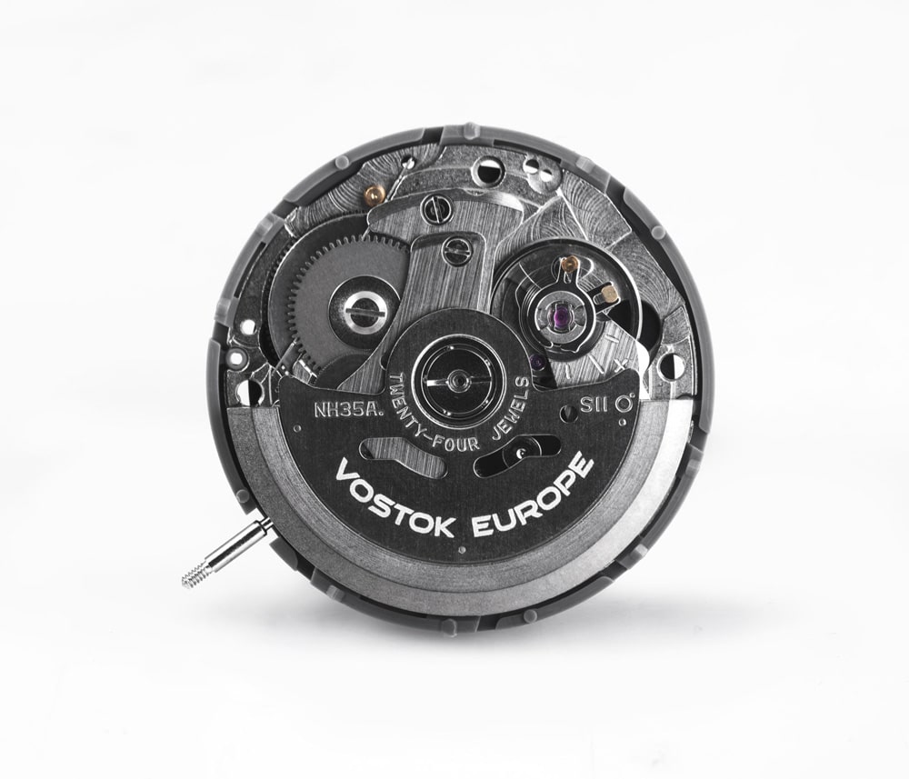 Sous le capot, on retrouve un calibre japonais NH35A provenant de la manufacture Seiko. Résistant et précis, il est doté de 24 rubis et offre une réserve de marche d’environ 40 heures.